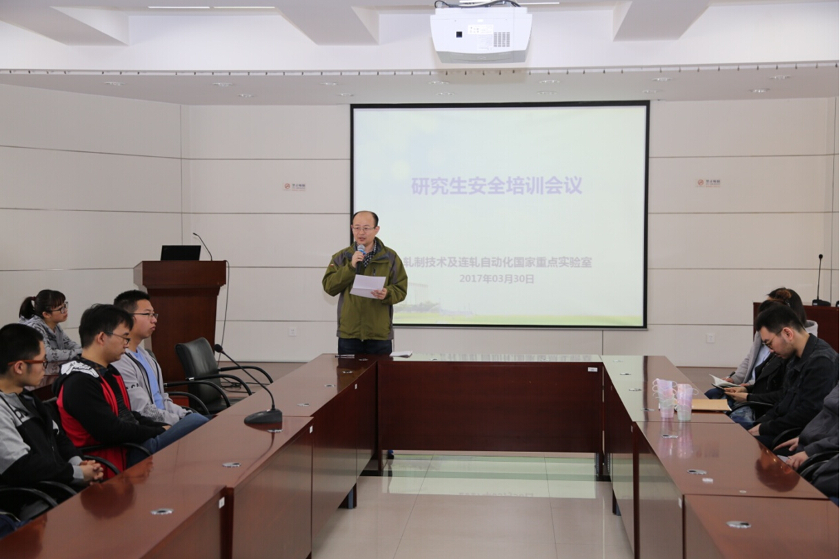 培训会议由实验室副主任丛广宇老师主持。丛主任宣讲了东北大学关于实验室技术安全管理、技术安全检查、技术安全准入等相关政策及实验室层面的安全生产及防火制度、教育培训制度、安全检查制度等。进一步强调了实验室内大型轧机设备操作、特种机械设备操作、精密仪器设备操作、化学药品操作等方面安全培训的重要性,并结合真实案例提醒同学们“安全无小事”。