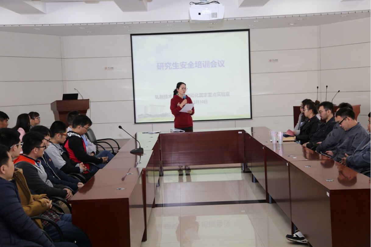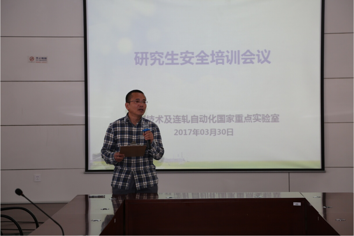 培训会议由实验室副主任丛广宇老师主持。丛主任宣讲了东北大学关于实验室技术安全管理、技术安全检查、技术安全准入等相关政策及实验室层面的安全生产及防火制度、教育培训制度、安全检查制度等。进一步强调了实验室内大型轧机设备操作、特种机械设备操作、精密仪器设备操作、化学药品操作等方面安全培训的重要性,并结合真实案例提醒同学们“安全无小事”。