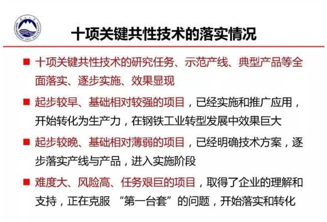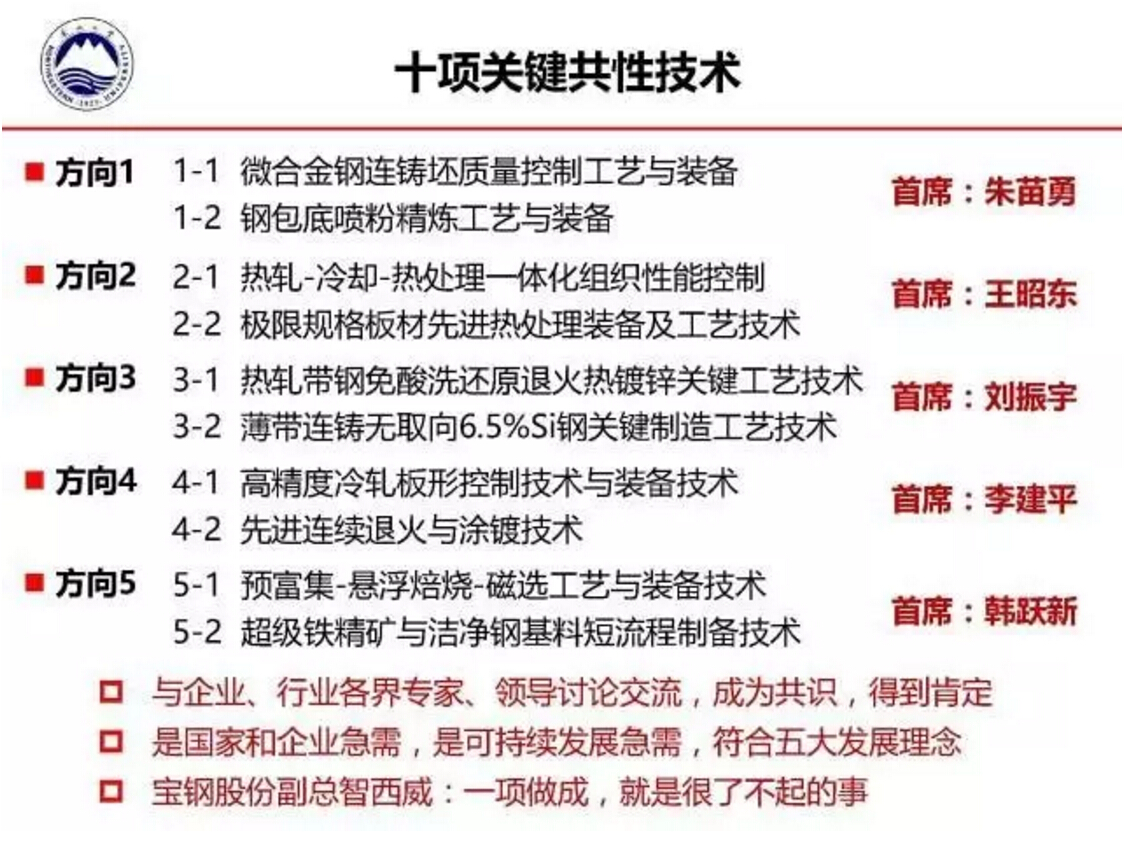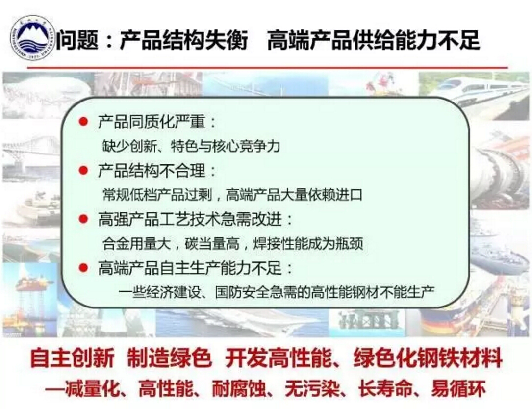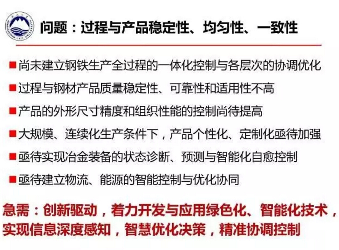 王国栋指出,当前我国钢铁工业存在产品结构失衡,高端产品供给能力不足,过程与产品稳定性、均匀性、一致性不足等问题,因此急需通过自主创新,开发高性能、绿色化钢铁材料,急需通过创新驱动着力开发与应用绿色化、智能化技术,实现信息深度感知、智慧优化决策以及精确协调控制,这样才能开发出减量化、高性能、耐腐蚀、无污染、长寿命、易循环的材料。为此,由东北大学和北京科技大学牵头的“2011钢铁共性技术协同创新中心”目前已经提炼出从采矿选矿到钢铁产品生产等覆盖全流程的十项关键共性技术。