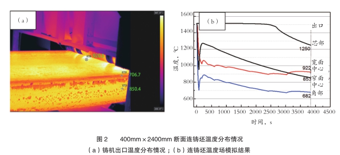 为了对连铸机出口温度分布情况进行评估,采用热像仪对某厂连铸机出口温度情况进行了现场测量,并根据现场连铸工艺,结合有限元数值模拟技术对连铸机出口温度场进行了分析。图2给出了断面规格为400mm×2400mm的Q345,在拉速0.65m/min的条件下连铸机出口的实测表面温度及数值模拟计算的温度场计算结果,其中铸坯表面温度约为920℃,芯部温度约为1250℃,芯表温差高达330℃,并且若通过二冷配水控制以及铸机拉速提升至对应规格设计的最大拉速,铸坯表面温度及芯表温差还有进一步提升的空间,这表明在连铸机出口布置大压下量轧机进行高温大压下轧制在工艺上是可行的。