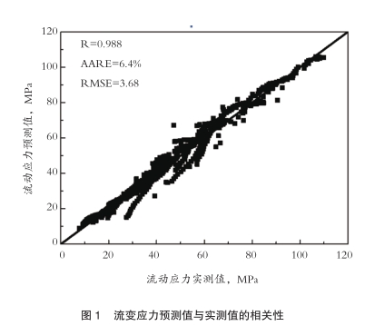 实验钢高温变形流变应力模型预测值与实测值的相关程度如图1所示。预测值与实验值的相关系数R和平均相对误差AARE分别为0.988和6.4%,具有很好的计算精度。