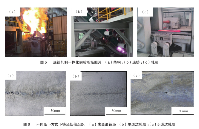为了验证高温粘塑性区轧制对铸坯芯部质量的改善效果,以C-Mn钢为原料,在实验室条件下开展了一系列炼钢-连铸-轧制一体化实验,实验流程为首先按给定的成分进行炼钢,然后在连铸实验机上浇铸成135mm×135mm断面的方坯,浇铸结束后,快速进行火焰切割,将切割后的铸坯用叉车迅速运至热轧实验机进行轧制,火焰切割和运输的累积时间一般可控制在1min之内,有效地保证了轧制时的开轧温度和芯表温差,实验过程的照片如图5所示。