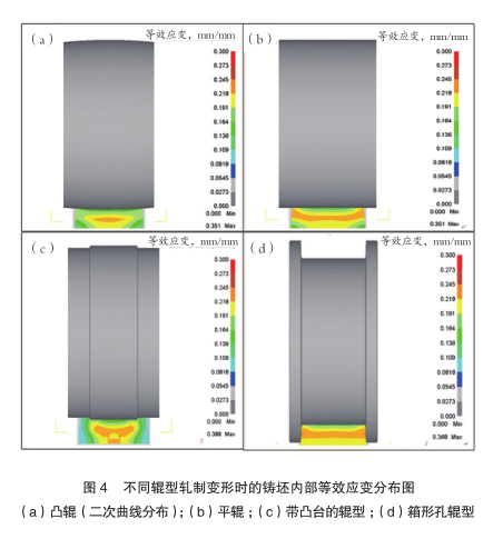 轧辊的辊型对大断面方坯高温粘塑性区轧制过程变形渗透性及金属的流动规律具有重要影响,研究人员在大断面方坯连铸过程温度场数值模拟分析的基础上,进一步利用数值模拟的研究手段分析了平辊、凸辊(二次曲线分布)、带凸台的辊型和箱形孔辊型四种形式的辊型,对变形区内铸坯内部金属流动和芯部变形渗透性的影响规律。不同辊型轧制过程中轧件内部等效应变的分布情况如图4所示,可以看出带凸台的辊型轧制变形时芯部等效应变明显优于其他辊型,因此带凸台的辊型改善了铸坯芯部受力状态以及金属流动状态,更有利于促进连铸坯芯部缺陷改善。