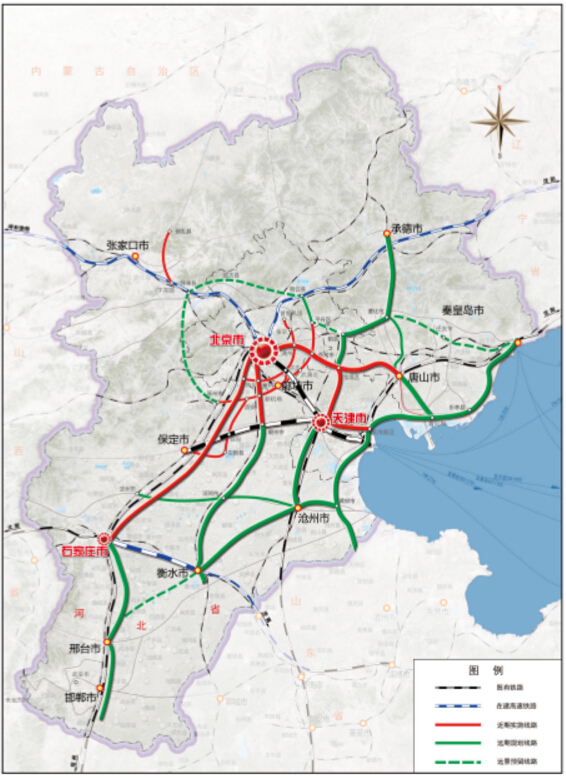 规划范围包括北京市、天津市和河北省,规划方案提出发展目标,以“京津、京保石、京唐秦”三大通道为主轴,到2020年,与既有路网共同连接区域所有地级及以上城市,基本实现京津石中心城区与周边城镇0.5~1小时通勤圈,京津保0.5~1小时交通圈,有效支撑和引导区域空间布局调整和产业转型升级。远期到2030年基本形成以“四纵四横一环”为骨架的城际铁路网络。