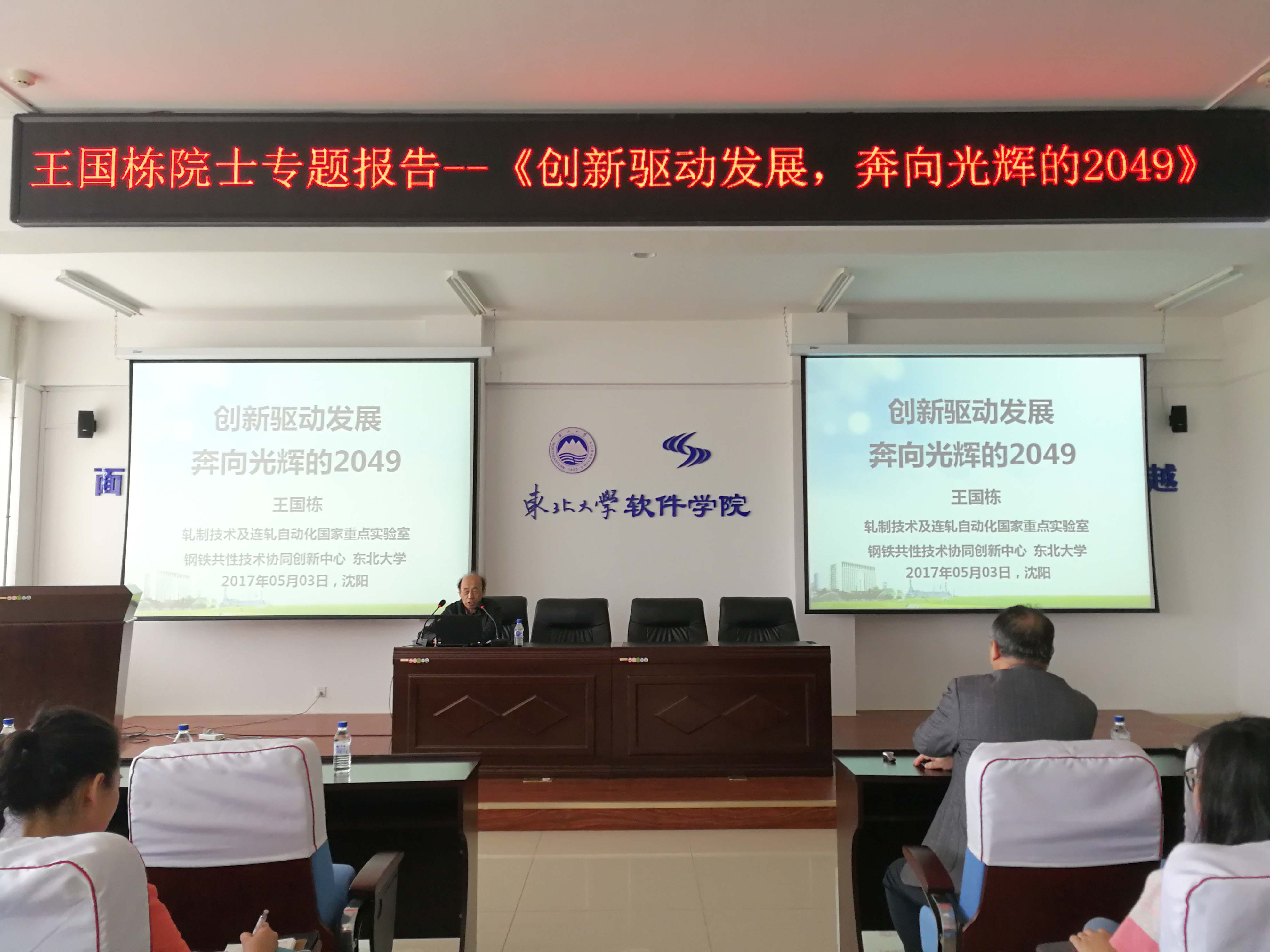 5月3日,中国工程院院士王国栋在浑南校区信息学馆B520室为软件学院师生作了《创新驱动发展,奔向光辉的2049》专题报告。学院全体教职工及部分博士、硕士研究生参加了报告会。软件学院院长王兴伟主持报告会。