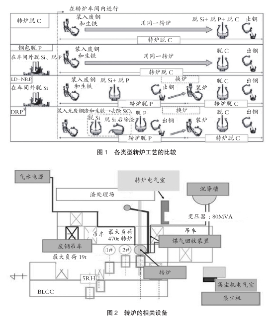 JFE公司福山第二炼钢厂开发出DRP?精炼工艺,DRP?精炼工艺利用铁水潜热将废钢熔化,并将脱Si吹炼后的高SiO2渣放出,然后进行脱磷吹炼。西日本制铁所(福山地区)为提高优质产品生产能力和降低生产成本,推进DRP?工艺的实施。图1是包括DRP?在内的各类转炉生产工艺的比较。西日本制铁所(福山地区)的重点生产厂是第三炼钢厂。过去为了保证粗钢产量,采用两座转炉进行脱C处理的生产体制。现在为了提高第三炼钢厂的产能和实施DRP?,在第三炼钢厂新建一座转炉。