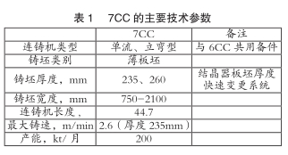 表1是7CC的主要技术参数。7CC是以福山6号连铸机(6CC)为基础的立弯型单流连铸机。7CC的计划产量是200kt/月、机长44.7m。为提高作业率,配置了浸入式水口快速更换装置。为了生产汽车用钢等高质量产品,与5CC一样,使用了钢流控制(FC)结晶器,对结晶器内钢水流动进行控制。此外,还配置了在线厚度变换装置(结晶器短边快速更换),连铸板坯厚度是235mm、260mm。
