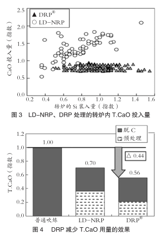 DRP?处理后的钢水P含量与传统的LD-NRP法同等。图4是DRP?法减少T.CaO用量的效果。DRP?法的T.CaO用量比普通吹炼方法减少了44%。