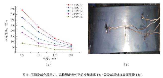 2)开展无氧化快速冷却技术实验研究,设计了冷却介质循环供给系统和雾化喷射装置,验证了无氧化冷却技术的可行性和安全性,研究了冷却介质压力、流量对试样冷却速率的影响以及不同厚度试样的极限冷却速率。结果表明,随着冷却介质喷射压力的提高,试样的冷却速率提高,针对1mm试样,冷却介质喷射压力为0.25MPa时,冷却速率接近240℃/s(图6(a)),且表面质量良好(图6(b))。