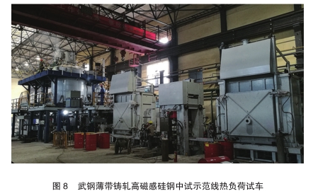 薄带铸轧+炉卷温轧制备高磁感硅钢技术工程化应用取得突破,结合国家“863”节能型电机用高硅钢开发项目,由东北大学与武汉钢铁集团公司签署合作项目,利用“2011计划”东北大学钢铁共性技术协同创新中心在薄带铸轧+温轧领域的前沿性技术优势,在武钢国家硅钢工程中心中试工厂建设国内外首台套“500mm薄带铸轧工业化示范线”,开发出具有完全自主知识产权的“薄带连铸+炉卷温轧制备 6.5%Si等难变形薄带材料原型机装备”,同时,在武钢中试工厂产业化示范应用实施。目前,该项目已经完成全线工艺设备的热负荷试车工作。2017年4月16日,科技部高技术中心专家组在武钢进行了“节能型电机用高硅钢开发”项目验收并对薄带连铸+炉卷温轧工业化示范线进行了现场考察,给出了评定意见:1)提出了真空冶炼、双辊铸带、多道次可逆热轧、温轧和全流程气氛保护的6.5%Si钢的生产成套工艺技术,开发出6.5%Si钢近终形制造的关键设备;2)实现了6.5%Si薄