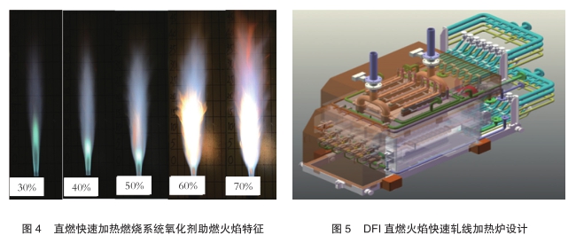 1)针对现有DFI技术存在的问题,开发出具有自主知识产权的窄间距多火焰烧嘴、火焰脉冲燃烧控制技术和火焰宽度控制技术。脉冲燃烧控制系统极大简化,成本降低,火焰宽度控制方法和装置简单、可靠;针对自主研发的烧嘴,对其燃烧效率、火焰特性、加热速率、污染排放等问题开展有限元模拟研究和实验研究,优化了烧嘴结构和燃烧工艺参数,获得了火焰特性数据(图4),薄板加热速率达到180℃/(s·mm),通过调整空燃比,控制带钢表面氧化程度,为DFI加热系统设计奠定基础;在此基础上设计制造了DFI加热炉(图5)以及相应的工件传输、气体供给控制等系统,应用于RAL和武钢薄带温轧加热,实现工业化原型机的突破。