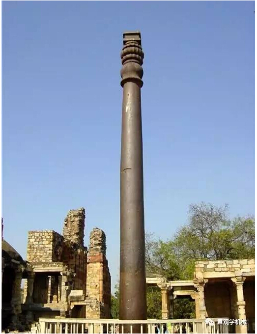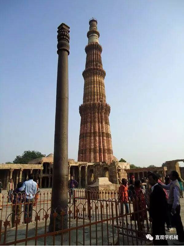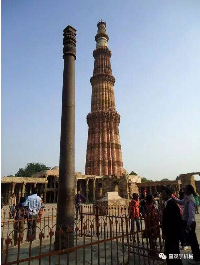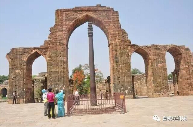 德里铁柱耸立在印度首都新德里Quwwat-ul清真寺。德里铁柱铸造于约1600年前,地面部分高7.25 米,约1.12米是埋藏在地下,直径约0.5米,重6.5吨,令人难以置信的是,这跟铁柱一直露天放置,历经了一千多年的风吹雨打,却鲜有锈迹,耐腐蚀性高达99%,堪称奇迹!