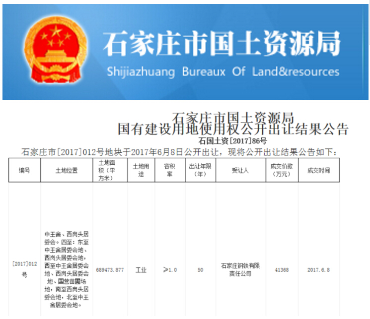 6月9日,石家庄市国土资源局发布了一则国有建设用地使用权公开出让结果公告,公告中成交的地块编号为[2017]012号地,该地块位于“中王舍、西岗头居委会。四至:东至中王舍居委会地、西岗头居委会地,西至中王舍居委会地、西岗头居委会地、国营苗圃场地,南至西岗头居委会地,北至中王舍居委会地”,占地面积689473.877平方米(约合1034.21亩),土地用途为工业用地,容积率≧1,出让年限50年,成交价款41368万元(4.1368亿元)。