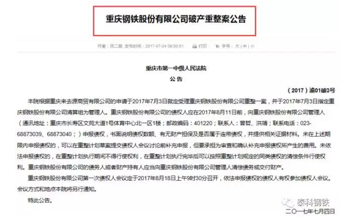 重庆钢铁股份有限公司第一次债权人会议定于2017年8月18日上午9时30分召开,依法申报债权的债权人有权参加债权人会议。会议方式和地点本院将另行通知。