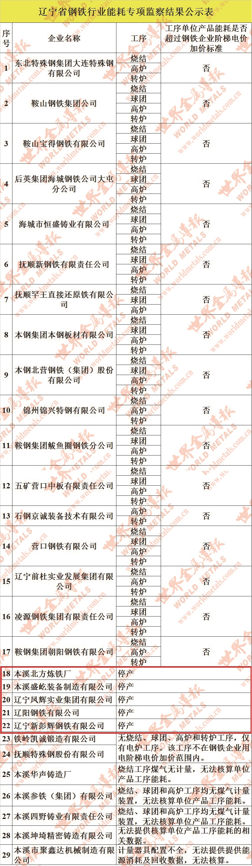 公示表显示,本溪北方炼铁厂、本溪盛屹装备制造有限公司、辽宁凤辉实业集团有限公司、辽阳钢铁有限公司、辽宁新彭辉钢铁有限公司等5家钢企已经停产;东北特殊钢集团大连特殊钢有限公司、鞍山钢铁集团公司、鞍山宝得钢铁有限公司、后英集团海城钢铁公司大屯分公司、海城市恒盛铸业有限公司、抚顺新钢铁有限责任公司、抚顺罕王直接还原铁有限公司、本钢集团本钢板材有限公司、本钢北营钢铁(集团)股份有限公司、锦州锦兴特钢有限公司、鞍钢集团鲅鱼圈钢铁分公司、五矿营口中板有限责任公司、石钢京诚装备技术有限公司、营口钢铁有限公司、辽宁前杜实业发展集团有限公司、凌源钢铁集团有限责任公司、鞍钢集团朝阳钢铁有限公司等17家钢企工序单位产品能耗未超过钢铁企业阶梯电价加价标准;铁岭凯诚锻造有限公司、抚顺特殊钢股份有限公司2家钢企因无烧结、球团、高炉和转炉工序,仅有电炉工序,且该工序不在钢铁企业用电阶梯电价加价范围内;本溪华声铸造厂、本溪参铁(集团)有限公司、本溪四野铸业有限责任公司、本溪坤埼精密铸造有限公司、本溪市聚鑫达机械制造有限公司5家钢企无法核算单位产品工序能耗。