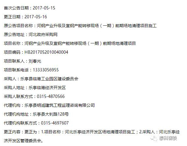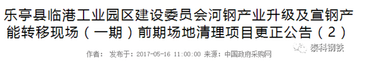 2017年5月16日,乐亭县临港工业园区建设委员会发布河钢产业升级及宣钢产能转移现场(一期)前期场地清理项目公告。