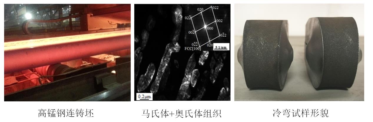 在高锰钢冶炼-连铸方面,解决了高锰高效合金化与防锰高真空气化的技术难题,实现了钢成分精确控制与钢水高洁净度生产;开发集成了低过热度浇注、二冷超弱冷却、铸坯凝固末端电磁搅拌以及动态轻压下等高锰海洋平台用钢连铸技术,实现了高质量连铸坯的稳定生产。在组织均匀性控制及热加工工艺方面,创新地采用连铸坯热送、高温终轧和直接淬火回火等技术,缩短了高强韧中厚板钢材的工艺流程,大幅降低了生产成本。中厚板全厚度获得了亚微米尺度的回火马氏体+逆转变奥氏体复合层状组织,实现了高强度、高韧性和高延伸率的良好匹配,且屈强比可控,焊接性能和冷弯性能良好。