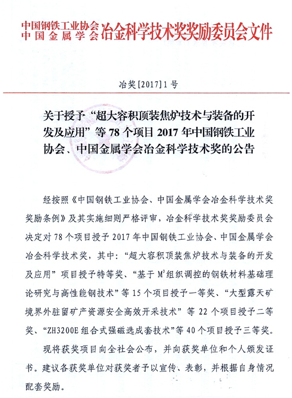 据悉,本年度冶金科学技术奖共评出78个项目,其中特等奖1项、一等奖15项、二等奖22项、三等奖40项。