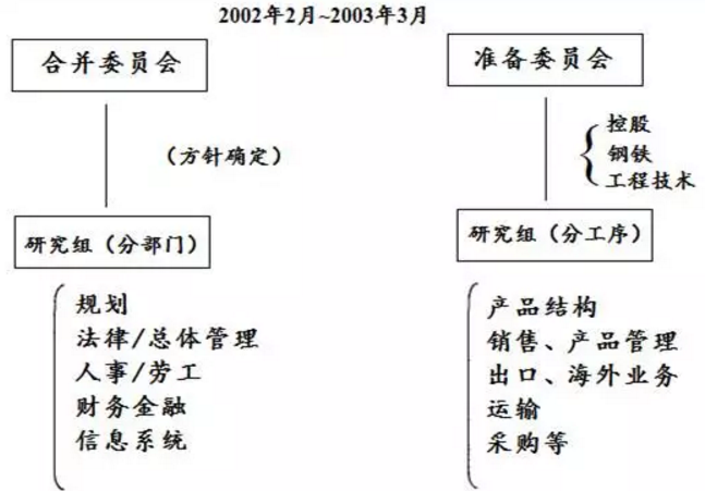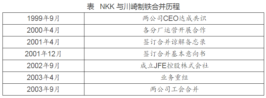 自1999年12月份起,NKK和川崎制铁开始进行有关合并重组的协商。初期,由于双方股价差别较大,不便立即合并,两家公司便认真研究其他企业在合并中的经验教训,以制订自身的发展战略,为合并做好准备。2000年4月份,双方开始寻求合作的可能性;2000年9月份,两家公司开始在物流、维修和原材料采购方面开展合作;合并事宜最终于2001年5月份宣布,并成立合并相关委员会。(见下图)