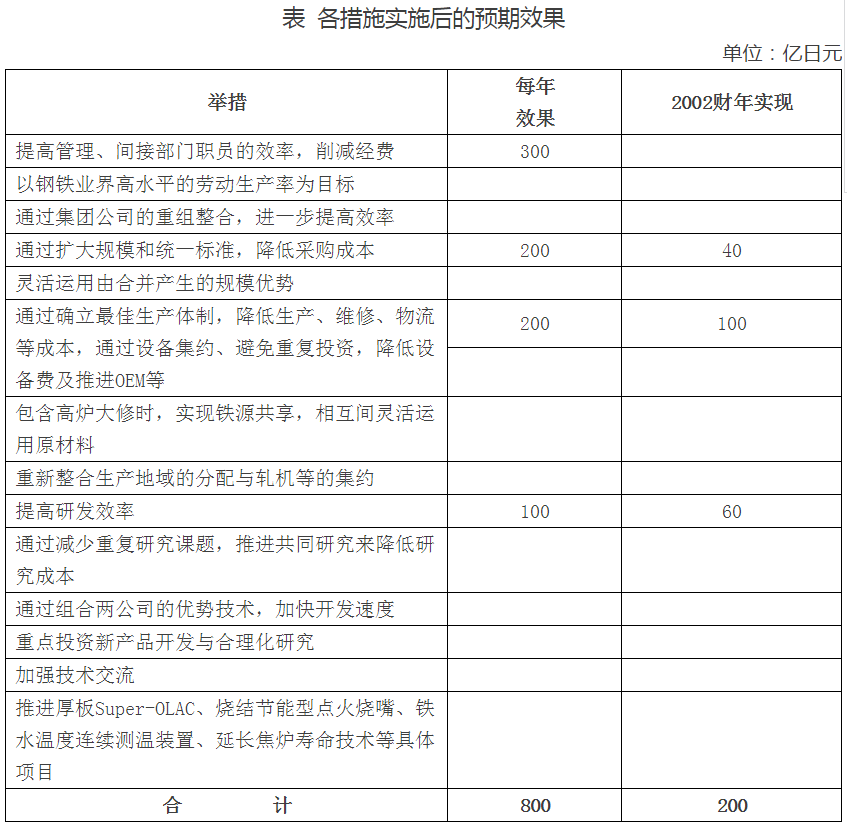 合并以后,为实现最大化的合并效果,JFE主要采取以下措施(如下表)确保了JFE集团的国际竞争力。