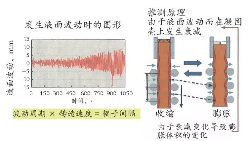 在连铸工序,检测出结晶器内的钢水液面,并通过中间包滑动水口的开闭控制钢水流量,但如果提高连铸速度,就会产生周期性很强的液面波动。从结晶器拉出的铸坯在辊子间膨胀,这是一种与膨胀-收缩大小同步,液面水平上下变化产生的“非稳态膨胀性波动”(图1)。这种液面波动一旦变大,就会产生保护渣卷入缺陷,从而造成轧件缺陷。
