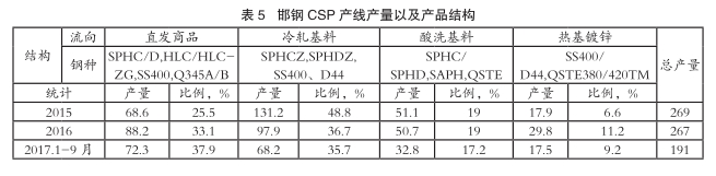 2016年,邯钢CSP产线总产量达到267万吨,与上年基本持平。2017年1-9月份,邯钢CSP产线供厂内深加工工序用料占CSP总产量的62.1%。其中:冷轧用钢:35.7%;热基酸洗用钢占17.2%;热基镀锌用钢占9.2%,见表5。