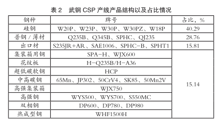 近几年,武钢CSP产线产量一直维持在200万吨水平,所生产的主要产品包括硅钢基料、普碳钢薄材、集装箱用钢、中高碳钢、花纹板、高强钢等,其中,硅钢基料占比超过40%,普碳钢薄材占比接近30%,另外,出口材所占比重接近16%,见表2。