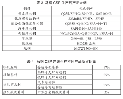 马钢CSP投产初期70%-80%直接供本公司冷轧厂作冷轧原料,其余直接作为热轧商品卷销售。随着市场需求的不断变化,该公司调整了不同产品所占比重,特别是降低了冷轧基料所占比重,目前已降低到47%。其中,热轧商品卷和硅钢基料所占比重均为25%,见表4。