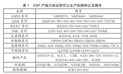 ESP生产线全长180m,产品厚度为0.8-6.0mm,最大宽度达1600mm。ESP无头轧制生产技术适合生产的钢种范围宽,目前已经证明可以生产的钢种包括低碳钢(一般结构钢、耐蚀钢、冷成型钢)、微合金钢、多相钢、管线钢、压力容器钢、含硼钢以及高碳钢(见表1),未来将开发生产先进高强钢(DP1200、TRIP800)、硅钢(无取向和取向)和超低碳钢(DD14、 DC03-DC06/IF)。