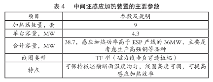 MCCR生产线的主要工艺设备特点:弧半径5.5m直弧型连铸机,板坯厚度为110-123mm,根据钢种要求,设计最大拉速6.0m/min,能够使一台单流薄板连铸机最大年产能达到约220万吨;隧道式加热炉长约80米,具有基本缓冲功能,设备操作更灵活;轧机分两组,分别是三机架大压下量轧机和五机架精轧机;专用高压水除鳞机;一个强制冷却系统;一个感应加热系统,用于在无头轧制模式下稳定地生产薄带钢和超薄带钢。MCCR多模式连续铸轧生产线主要设备参数见表2。