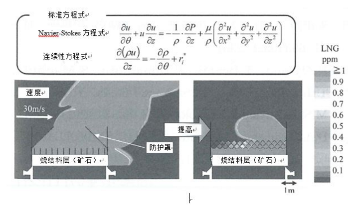 详细研究的结果,在该项技术实用化中,在烧结机上设置防护罩,由配置其中的喷嘴喷吹LNG。但是,防护罩方式,需要综合性研究防护罩结构、内部的LNG喷嘴规格、万一泄漏时的早期检测系统及其应对措施,运用数值计算后,对喷吹LNG时喷入气体的行为进行了模拟。
