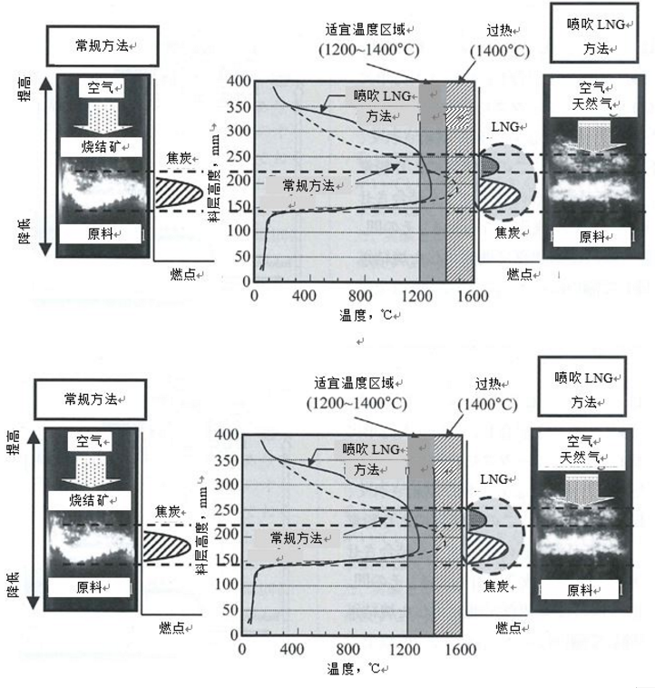 通过试验,比较了只用常规焦粉的烧结法和喷吹碳氢化合物的烧结法的料层内温度分布。在本试验中,作为碳氢化合物燃料,使用了气化的液化天然气(LNG),图2是烧结料层高度方向的温度分布。在常规方法中,存在1400℃以上的温度区域,而在喷吹气体燃料方法中,由于焦粉的使用量适当,1200℃以上的温度区域扩大,不存在1400℃以上的温度区域。此外,在喷吹气体燃料法中,可以观察到燃烧区域分为两个。根据这些结果,与空气混合后,从原料表面喷入的气体燃料从焦粉的燃烧位置上方燃烧,即可以实现在高度方向焦粉与气体燃料的燃烧位置不同的燃烧状态,因为可以延缓烧结矿的冷却速度,烧结料层内1200~1400℃温度区域扩大。