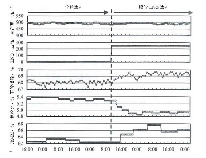 图6是引入气体燃料喷吹技术前后的操作参数及品质指标的变化。在试验中,保持产量一定,调查了烧结矿品质。开始喷吹LNG后,强度提高约1%。进而,固体燃料焦粉的配合率可以降低0.3%。烧结矿的还原性也逐渐上升,最终确认有4%的改善效果。