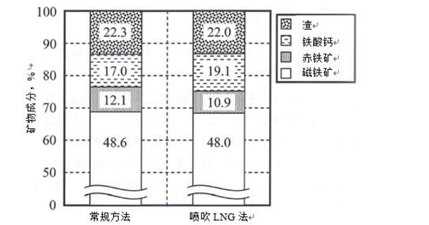 在引入气体燃料喷吹技术前后,对烧结矿进行了取样,图7是用X射线衍射法进行组织定量分析的结果。从分析结果可以确认铁酸钙组织的量从17.0%增加到19.1%,渣组织减少,与实验室研究一样。因此,认为图6所示的烧结矿品质改善效果是由于烧成时的温度适宜使铁酸钙组织增加和渣组织减少所致。