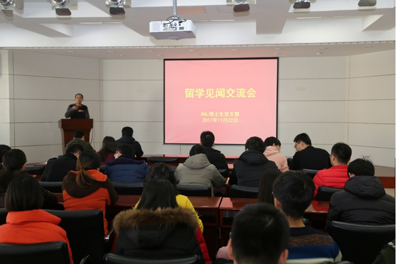 2017年11月22日,我室博士生党支部在RAL411报告厅举行了博士生党员留学见闻交流会,党支部成员王鸿雨和姬凤芹博士生分享了留学交流期间的见闻和感受,实验室部分教工党员和全体博士生党员参加了此次交流会。