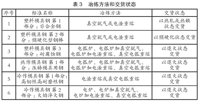 6项标准中所规定的常用冶炼方法和一般交货状态见表3。在规定常用冶炼方法的同时,标准还规定了可以采用能满足标准要求的其他冶炼方法。