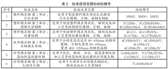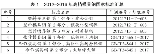 2012-2016年,依托我国钢铁行业标准化科研能力,由全国钢标准化技术委员会特殊钢分技术委员组织,完成了6项高档模具钢国家标准的研制,详见表1。以上6项标准中热作模具钢、冷作模具钢的3个项目已批准发布,塑料模具钢3个项目已通过委员会的专家审查并上报国家标准化管理委员会,处于批准发布阶段。这6项标准的制定体现了目前我国模具钢领域的技术和产业发展水平,完善了我国模具钢标准体系,可操作性强,具有一定的前瞻性,标准技术指标先进、合理,能够较好地规范目前我国模具钢生产,标准的整体水平达到国际先进水平。