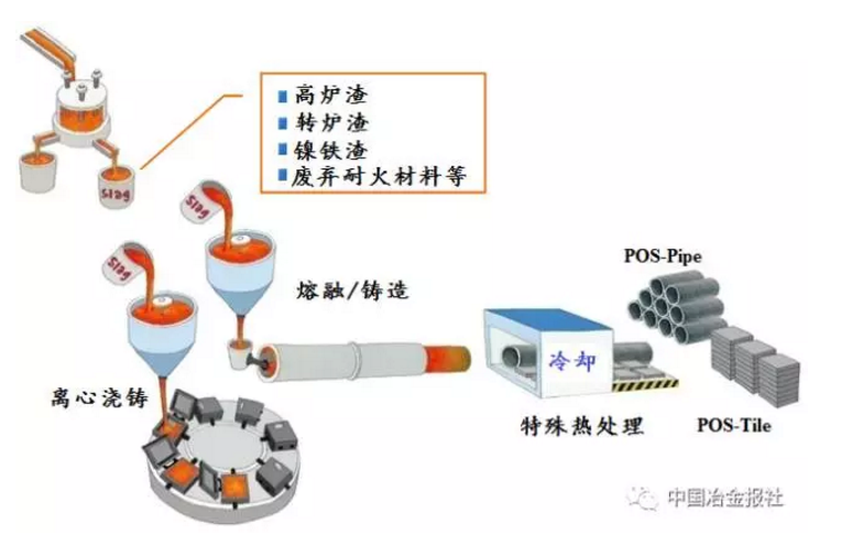 1997年9月份创立的韩国Dongdo Basalt工业公司,在2011年~2014年间与浦项联合实施了名为“利用POSCO炉渣开发耐热/耐磨材料”的项目,开发出“干式熔融法”技术,可将高炉渣、转炉渣和镍铁炉渣等各类钢铁炉渣,或废弃耐火材料制备成耐磨损、耐腐蚀的高性能仿玄武岩产品POS-Pipe和POS-Tile。其中,POS-Pipe是通过高温熔融或特殊冷却处理开发出的不易开裂的、抗压强度高的管材产品,POS-Tile是采用离心浇铸的方式制备出的抗压强度和耐磨性高的砖瓦产品。其生产工艺流程如下图所示。