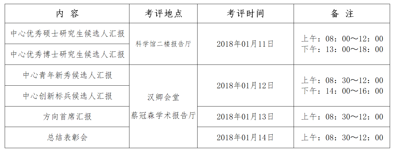 “中心”定于01月11日~12日,组织各方向首席、受聘人员开展中心差额评优工作。同时,中心于01月13日上午召开2017年度方向首席述职考评会,向中心及学校领导总体汇报各方向年度及聘期工作进展情况,于01月14上午召开2017年度总结表彰大会。具体日程表详见附录。