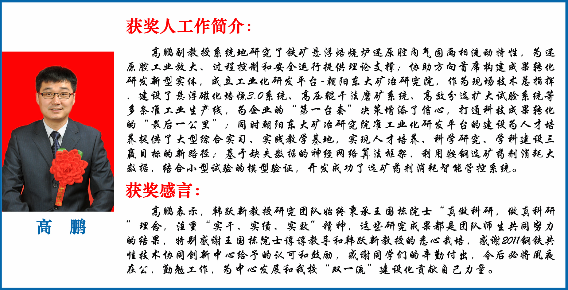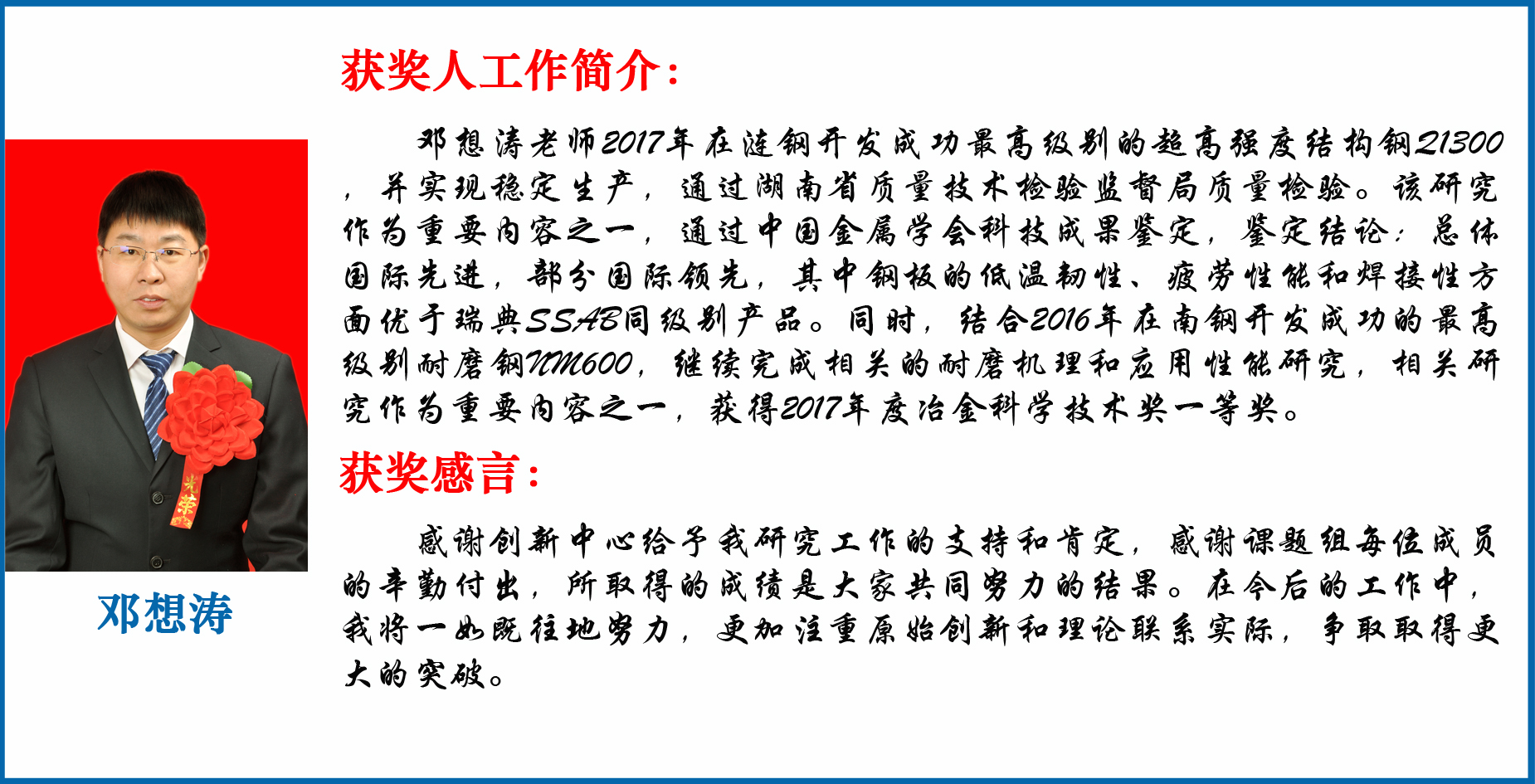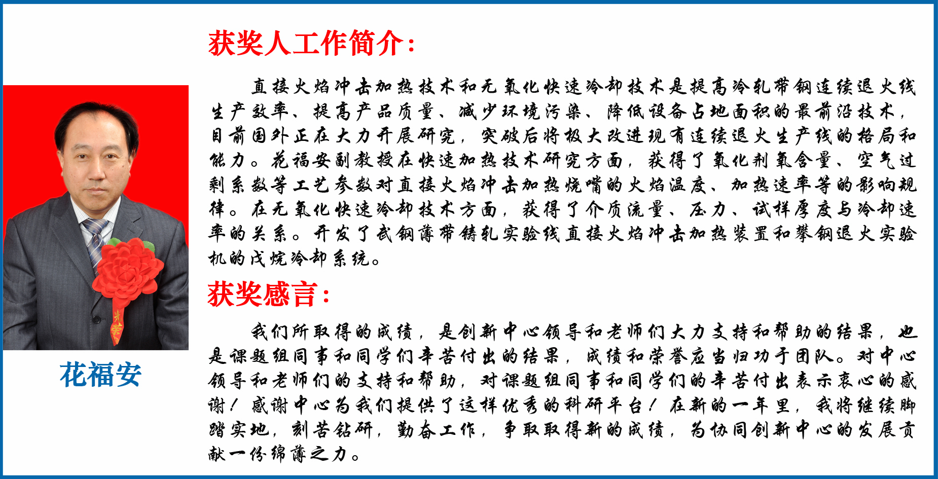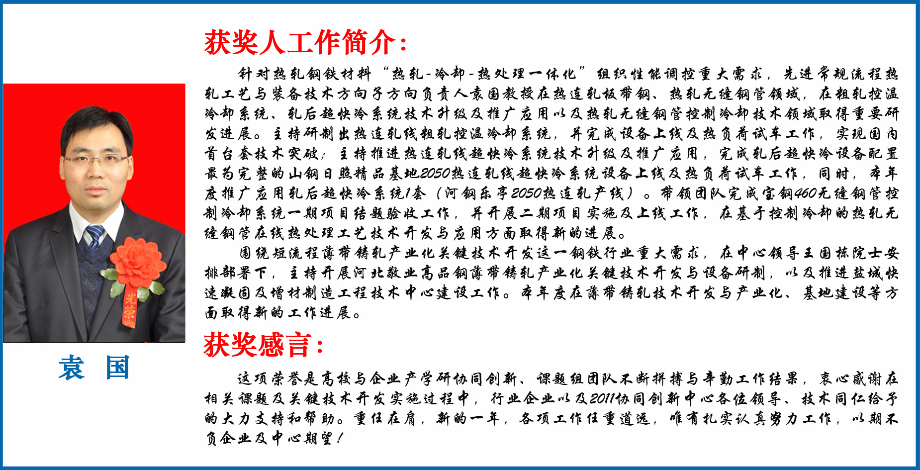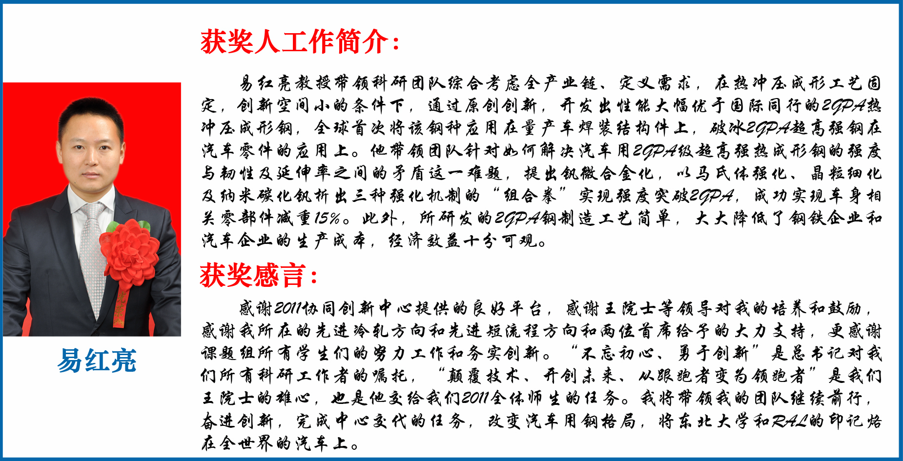 东北大学2011钢铁共性技术协同创新中心年度考核工作从1月6日起拉开帷幕,整个考核工作历时一周,分为各研究方向自评、中心考评和优秀团体、优秀个人评选三个阶段。中心坚持以质量和贡献为重点、激励与约束相结合的考评方式,促进中心的良性发展。通过评选,易红亮等11名教师获得“创新标兵”称号,以下为“创新标兵”获奖感言。