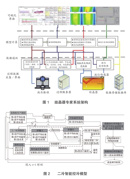 连铸是承接炼钢与轧钢最关键的环节,连铸生产顺行及铸坯高质化生产是钢铁企业所关注的重中之重。结晶器作为连铸机的心脏,钢水在结晶器内的凝固行为直接决定连铸坯质量。与此同时,结晶器生产过程工艺及控制的稳定性直接决定连铸生产的顺行。因此,结晶器的智能化控制显得十分必要和迫切。东北大学开发了连铸结晶器智能化专家系统,其系统基本架构如图1所示,包括数据采集层(一级自动化检测)、数据通讯层(一级与二级系统间无缝通讯)、模型计算层(系统的核心部分)、过程可视化层。具备热监控功能、振动及摩擦力监控功能、结晶器润滑效果评价、漏钢预报监控、液位自动控制等功能,能够准确监测液面波动、局部热流动态变化、实际坯壳“热点”追踪、渣道内保护渣液/固渣组成比例及厚度分布、结晶器铜板摩擦力、坯壳动态凝固生长等信息,有效降低了漏钢误报率,实现了连铸过程的安全、稳定生产。