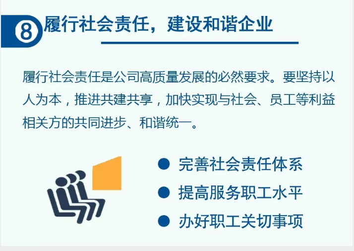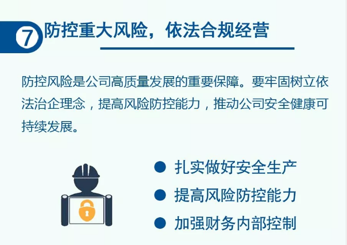 六是要加强党建工作。一方面要全面抓好党的十九大精神落实,另一方面要全面加强党的建设,落实新时代党的建设总要求,注重解决问题、破解难题,推进党建工作和经营发展紧密融合。