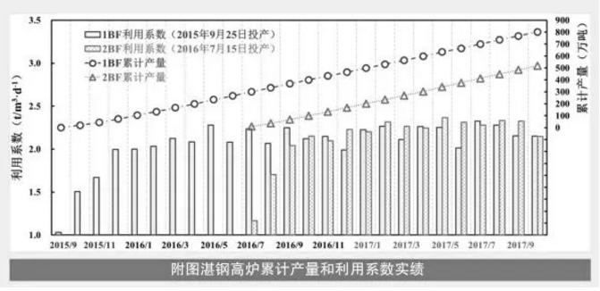 科学选择合理的操作制度是宝钢高炉生产长期保持稳定顺行的前提,包括送风制度、装料制度、造渣制度和热制度。合理的送风制度和热制度是保证高炉炉况稳定顺行的前提,合理的煤气流分布是实现高炉长寿的关键技术之一。如附图所示,目前,湛钢1号高炉累计产量达到800万吨,2号高炉也达到了500万吨。1号高炉在点火投产后炉况总体稳定顺行,前期受铁钢平衡和原燃料进厂影响,较长时间处于低利用系数冶炼阶段,在原料输入系统逐渐恢复后,1号高炉开始产量爬坡,利用系数迅速达到了2.30t/(m3·d)水平。2号高炉点火投产后产量快速爬坡,第3个月就实现了日产量达产,利用系数达到2.30t/(m3·d)水平。