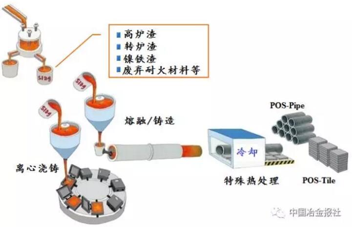 1997年9月份创立的韩国Dongdo Basalt工业公司,在2011年~2014年间与浦项联合实施了名为“利用POSCO炉渣开发耐热/耐磨材料”的项目,开发出“干式熔融法”技术,可将高炉渣、转炉渣和镍铁炉渣等各类钢铁炉渣,或废弃耐火材料制备成耐磨损、耐腐蚀的高性能仿玄武岩产品POS-Pipe和POS-Tile。其中,POS-Pipe是通过高温熔融或特殊冷却处理开发出的不易开裂的、抗压强度高的管材产品,POS-Tile是采用离心浇铸的方式制备出的抗压强度和耐磨性高的砖瓦产品。其生产工艺流程如下图所示。