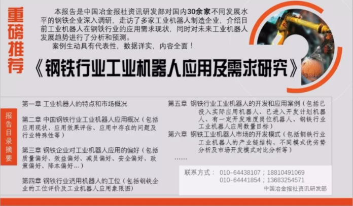 本报告是中国冶金报社资讯研发部对国内上下游30余家不同发展水平的钢铁企业及上下游企业进行深入调研,走访了多家工业机器人制造企业,乃我部呕心沥血之作。书中大量详实的数据和案例极具代表性,无论您是想搞智能制造,还是只想了解了解,都值得一看。毕竟,当今时代,不涨姿势(知识)就落伍啊!