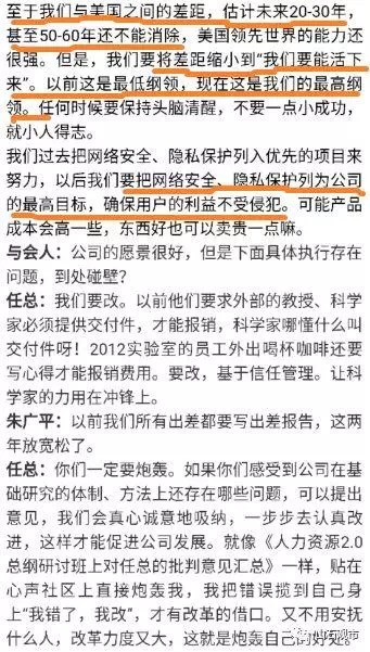 任总:你们一定要炮轰。如果你们感受到公司在基础研究的体制、方法上还存在哪些问题,可以提出意见,我们会真心诚意地吸纳,一步步去认真改进,这样才能促进公司发展。就像《人力资源2.0总纲研讨班上对任总的批判意见汇总》一样,贴在心声社区上直接炮轰我,我把错误揽到自己身上“我错了,我改”,才有改革的借口。又不用安抚什么人,改革力度又大,这就是炮轰自己的好处。