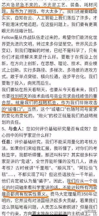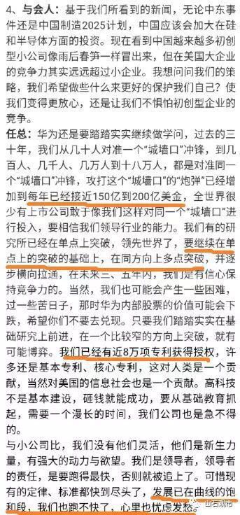 任总:华为还是要踏踏实实继续做学问,过去的三十年,我们从几十人对准一个“城墙口”冲锋,到几百人、几千人、几万人到十八万人,都是对准同一个“城墙口”冲锋,攻打这个“城墙口”的“炮弹”已经增加到每年已经接近150亿到200亿美金,全世界很少有上市公司敢于像我们这样对同一个“城墙口”进行投入,要相信我们领导行业的能力。我们有的研究所已经在单点上突破,领先世界了,要继续在单点上的突破的基础上,在同方向上多点突破,并逐步横向拉通,在未来三、五年内,我们是有信心保持竞争力的。当然,我们也可能会产生一些困难,过一些苦日子,那时华为内部股票的价值可能会下跌,希望你们不要去兑现。只要我们踏踏实实在基础研究上前进,在一个比较窄的方向上突破,就有可能博弈。我们已经有近8万项专利获得授权,许多还是基本专利、核心专利,这对人类是一个贡献,当然对美国的信息社会也是一个贡献。高科技不是基本建设,砸钱就能成功,要从基础教育抓起,需要一个漫长的时间,我们公司也是急不得的。