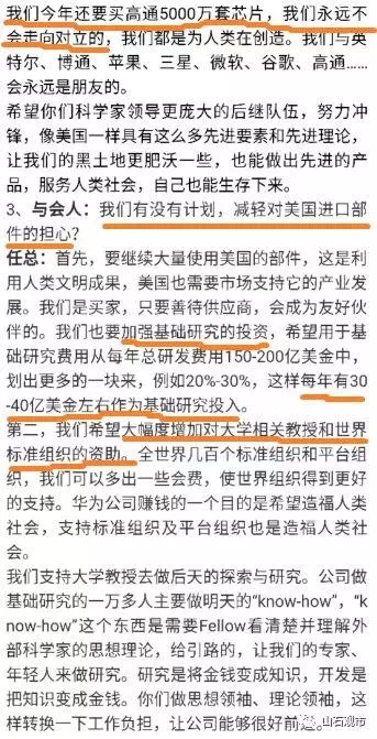 任总:首先,要继续大量使用美国的部件,这是利用人类文明成果,美国也需要市场支持它的产业发展。我们是买家,只要善待供应商,会成为友好伙伴的。我们也要加强基础研究的投资,希望用于基础研究费用从每年总研发费用150-200亿美金中,划出更多的一块来,例如20%-30%,这样每年有30-40亿美金左右作为基础研究投入。