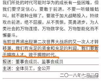 我们所处的时代可能对华为的成长有一些困难,但我们要坚定信心,要敢于前进。不要一听蝼蝼蛄叫,就不敢种庄稼了。要敢于加大战略投入,持续攻击前进,绝不屈服,从不畏惧,英勇进步,为人类社会的万物连接、万物数字化、万物智能化而不懈奋斗。