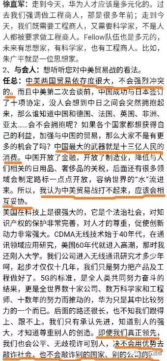 华为内部邮件被曝光,其内容为任正非5月15日、6月4日-13日,在Fellow及部分欧研所座谈会上的讲话。邮件显示,任正非在谈到中美贸易战时,着重提到两国贸易依存度很大,不会强烈冲突。而中国最大的武器就是十三亿人民的消费,这一因素促使中美贸易战打不起来,应该会相互妥协。